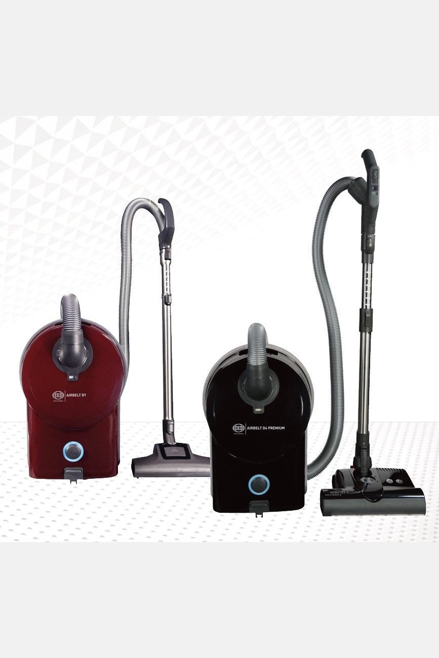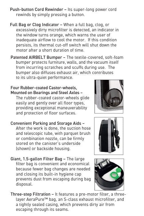 The two AIRBELT D models are powerful, ultra-quiet, full-size canister vacuum cleaners with three on-board attachments, a giant 1.5-gallon bag, an unmatched 40-foot cord and 52-foot cleaning radius, protective rubber-coated wheels, a durable telescopic tube with quick-release connections, and a full bag or clog indicator.
