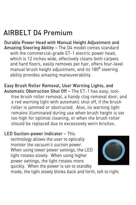 The AIRBELT D4 Premium offers much more! In addition to a parquet brush, it includes the commercial-quality ET-1 electric power head that cleans both carpets and hard floors, has excellent pet hair removal, and the extension side of its L-shaped contour makes cleaning under counters easy.
