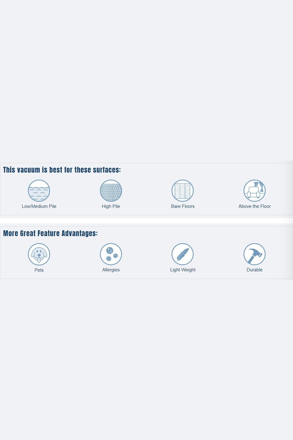 A unique tapered suction hose, with a 320⁰ rotating canister connection, increases their airflow velocity, minimizes clogs, and improves maneuverability. They also feature excellent filtration, a push-button cord rewinder, and a soft-foam bumper that protects the vacuum, furniture, and walls from scuffs and scratches.