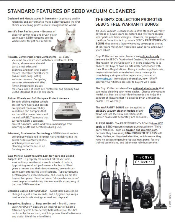 Three On-board Full-size Tools and Large Filter Bag The vacuum includes a crevice nozzle, dusting brush, and upholstery nozzle, along with a large 5.3-liter filter bag. Additional optional accessories are available.