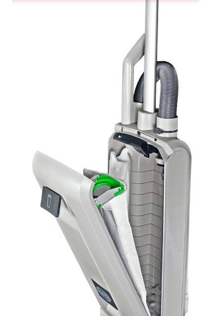 Made in Germany, the Essential G4 is a super durable, technically advanced, commercial-grade upright vacuum cleaner. The G4 has a 12-inch powerhead with a four-level manual height adjustment. The vacuum is excellent for cleaning carpets, hard-floor surfaces, and pet hair removal. In addition, the vacuum has an electronic controller that acts as a brain, alerting users to a worn brush or when brush height is set too high for optimal cleaning. The vacuum shuts off automatically when a full bag, a clog, or a brush roller obstruction occurs, which protects the motor, belts, and carpets from damage.